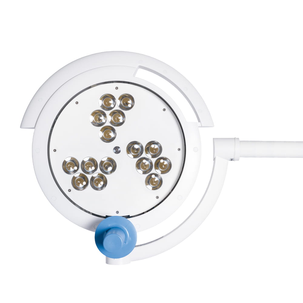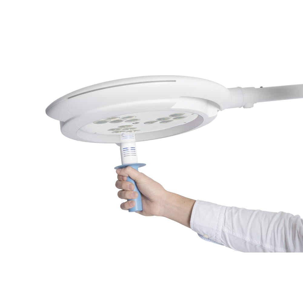 Kompaktowy i zaokrąglony kształt oprawy zmniejsza opór powietrza na salach operacyjnych z laminarnymi systemami przepływu i utrzymuje sterylność pola operacyjnego. Oddzielne sterowanie oświetleniem dla użytkowników sterylnych i niesterylnych zapewnia intuicyjną i bezpieczną obsługę. Włącz światło i kontroluj jasność, po prostu obracając niebieski sterylny uchwyt.